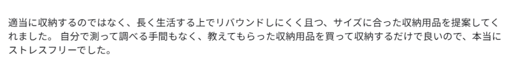 当サービスでは、「整理(不要な物を取り除く)」が完了した後に「収納(使いやすく収める)」というステップを重視しております。物が整理されていない状態で収納スペースにきれいに収まるように収納用品を組み合わせたところで、お客様にとって本当に使いやすい収納にはならない机上の空論になりかねないと考えているからです。