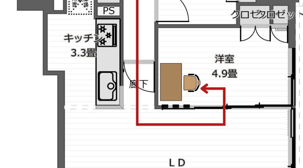- リビングに入ってからぐるっと回らなければいけない位置に机がある